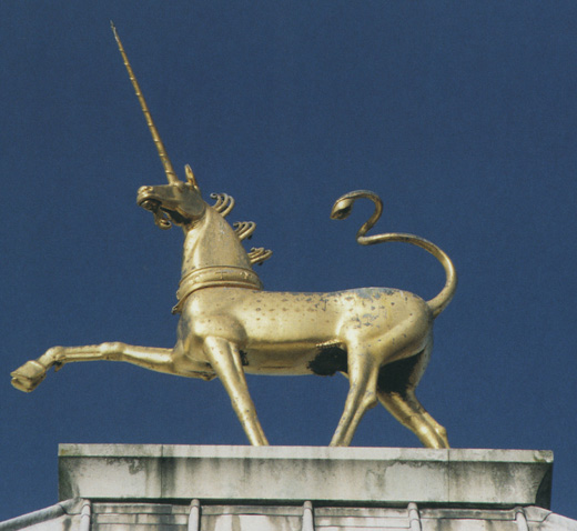 The Unicorn is a fabled creature symbolic of virginity and usually represented as a horse with a single straight spiraled horn projecting from its forehead. In heraldry a representation of this beast, having a horse's body, a stag's legs, a lion's tail, and a straight spiraled horn growing from its forehead is employed as a supporter for the Royal Arms of Great Britain or of Scotland.