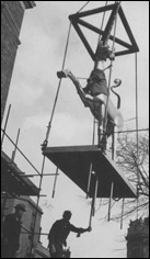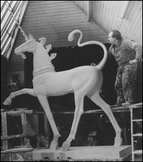 Daily Mail 7/10/50: "12 ft unicorns baffle the city fathers ... Yesterday ... a 12' high unicorn, one of two, stood ready to be hoisted up... but the hoisting never took place. It was stopped by Alderman Frank Sheppard, 83 year old chairman of the Council's building committee, who said "We knew nothing about the unicorns at all until today, and we decided to postpone their erection until the committee had considered the matter and the architect, Mr Vincent Harris, has been given a chance to explain ... Mr Harris's London office said that he was on holiday in Italy and could not be contacted. Mr David McFall, Chelsea sculptor who made the unicorns, could not solve the mystery."