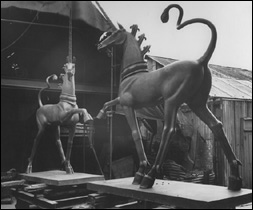 The Western Daily Press 25/10/50 front page "...£2,400 unicorns ... in the first plan the Unicorns would have stood either side of the main entrance to the Council House; now they will stand on top of the North and South Pavilions ... since the work on the unicorns was stopped, they have been housed separately under the pavilions at the Park St and Cathedral ends of the building. A narrow gauge railway was laid down on which to roll them behind locked doors"