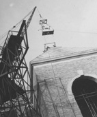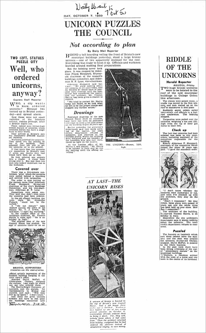 Bristol Evening Post 25/10/50 front page: " ... rising above the wooden fence ... appeared a gleaming, lantern-jawed, wild-eyed, stiff-legged figure. The first of Bristol's £2,400 architectural headaches, the twin Council House unicorns, was on its way up to its pedestal. The word to go ahead came late yesterday after Mr Vincent Harris ... had explained to the committee why he had ordered the gilt-painted one-ton unicorns. He had substituted them for a long and expensive length of ornamental ridging that would have cost £600 more".