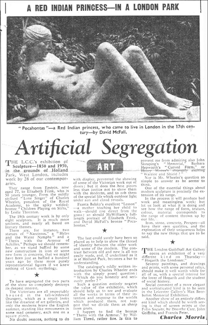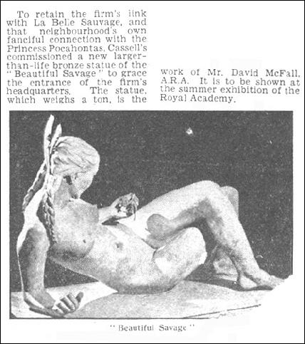 2) Birmingham Post 24/4/56 report of the Cassell's foundation stone laying by Churchill: "... To retain the firm's link with La Belle Sauvage, and that neighbourhood's own fanciful connection with the Princess Pocohontas, Cassell's commissioned a larger than life size statue of the "Beautiful Savage" to grace the entrance of the firm's headquarters. The statue, which weighs a ton, is the work of David McFall A.R.A. It is to be shown at the summer exhibition of the RA."