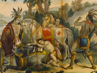 SMITH RESCUED BY POCAHONTAS 1870, Christian Inger (after Edward Corbould) - While some 19th-century images of Pocahontas highlighted her marriage to John Rolfe, countless others focused instead on her feelings toward John Smith. Most historians doubt that a full-fledged romance ever existed between Pocahontas and Smith, but this notion was widely spread in the early 19th century, sparked by writer John Davis, who transformed Pocahontas into the heroine of an elaborate romantic narrative. This 1870 lithograph shows a Pocahontas typical of such representations—Europeanized and overly nubile for an adolescent girl. It also bears inaccuracies common in late 19th-century artwork, when headdresses, horses, and tepees (the latter not seen in this detail), which are trappings of Western Plains cultures, became generic icons for all "Indians."