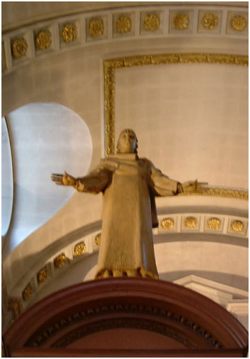 This statue, and that of St Paul, was part of the reconstruction of the Wren church under Architect W Godfrey Allen (see 1959/2), a successor to Wren as Surveyor to the fabric of St Paul's Cathedral, following St. Bride's destruction by German bombing on the night of 29th December 1940. The church was rededicated in the presence of the Queen and Prince Philip on December 19th 1957.