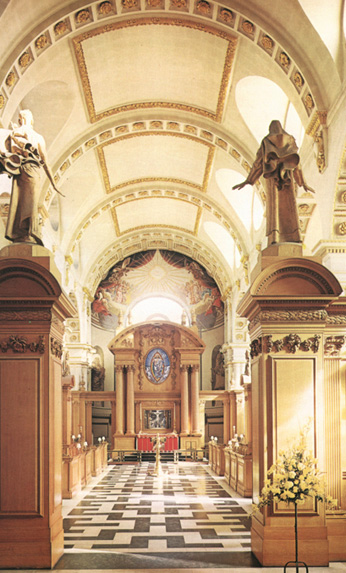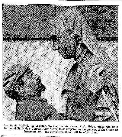 1) "Phoenix of Fleet Street"; Country Life 9/1/58 "... a difficult problem ... arises again when one turns to Mr McFall's compelling figures of St Bride and St Paul. Are they in scale and in spirit appropriate where they have been placed, above woodwork which so meticulously and miraculously reproduces the craftmanship of Wren's age It might have been a happier solution to have set them on pedestals flanking the tower arch, where they would have had an equally dramatic effect and the psychological conflict would not arise so acutely. It should be added that the present figures are the plaster models of those to be carved in wood."