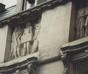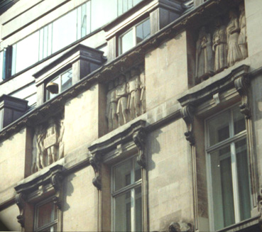 External Frieze The sculptured frieze and the figure of Justice surmounting the oriel at the angle of the original building are by Hamo Thorneycroft RA; the other 19th Century sculptures are by Harry Bates ARA. H A Stevenson sculptured the frieze which continues on the 1930's extension. The friezes are allegories in human form. Thorneycroft's contribution is first a series of panels depicting a range of concepts from the Arts and Sciences to the Colonies, and secondly a frieze depicting the professions and crafts connected with building. Stevenson's work depicts the history of architecture starting with a caveman on the extreme right and including Wren with a model of St Paul's. The truncated figures at the feet of the Statue of Justice are "the upper parts of figures representing accountants, one in the act of examining a candidate and the other auditing accounts".