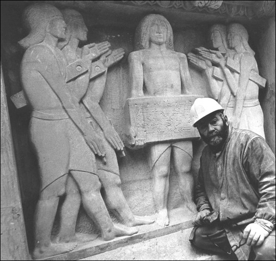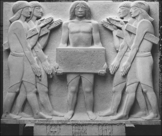 The figures were carved from imagination and McFall worked on these three friezes from April 1968 finishing in 1969. He first made clay and plaster models of each.