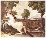 In one of his notebooks Leonardo da Vinci wrote: "The unicorn, through its intemperance and not knowing how to control itself, for the love it bears to fair maidens forgets its ferocity and wildness; and laying aside all fear it will go up to a seated damsel and go to sleep in her lap, and thus the hunters take it." [(Ashmolean Museum)"Young woman seated in a landscape with a unicorn", Leonardo, Late 1470s]