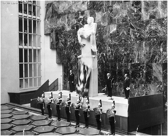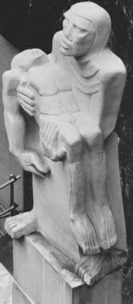 The work is a memorial to Trade Union victims of the two World Wars for the new TUC headquarters. A mournful evocation of loss, a lone woman supports the limp naked body of a dead soldier. It was carved from a 10 ton block of Roman stone and was originally backed by green Carrara marble running up to the roof; this decayed and has been replaced by green tiles as an economy measure.