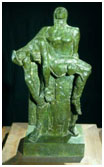 “Congress House, headquarters of the TUC since 1958, was constructed as a memorial to the sacrifices made by trade unionists in two World Wars. The idea for the building came from a resolution at the 1944 Congress. In addition to commemorating trade unionists’ war efforts, the General Council saw the creation of the new headquarters as an opportunity to promote interest in the arts and architecture. A competition for a suitable design, which attracted 181 entries, was won by David Du R Aberdeen. The building is centred on a courtyard beneath which is a conference hall that seats 500. ... The fourth side of the building consists of the memorial wall with its imposing work by Sir Jacob Epstein, carved on the spot from a single ten-ton block of Roman stone. A plaster maquette* for the work is displayed in the Bevin Room. It differs from the final work in a number of important respects, most notably that the figure of the soldier carrying a wounded comrade has become a mother carrying her fallen son.” [source TUC]